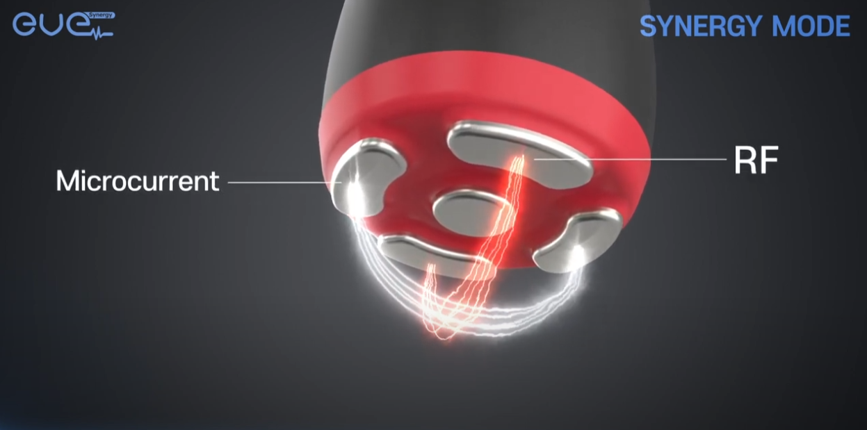 이브시너지는 미세전류(Microcurrent) + EMS(저주파) + RF(고주파) 세 가지 에너지를 복합적으로 사용하는 장비입니다.