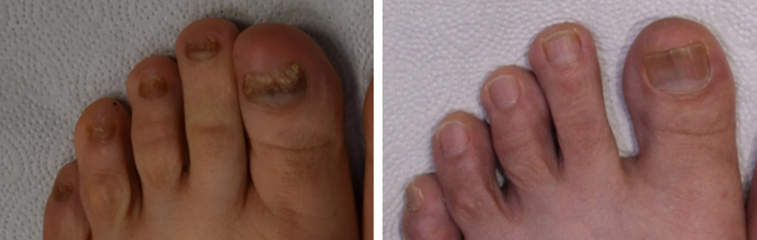 치료 전과 1년 후 경과를 보면, 엄지 검지 발톱 상태도 정상화되었고 나머지 발가락의 상태도 모두 좋아진 것을 볼 수 있습니다.