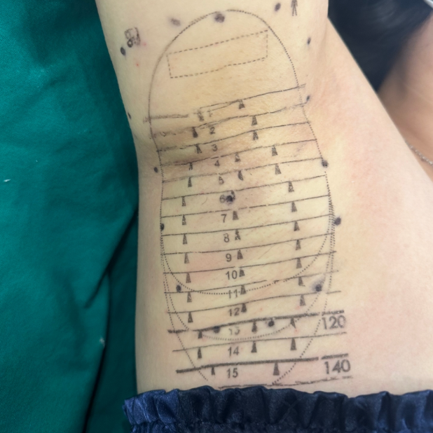 국소 마취 후 미라드라이 전용 템플릿을 이용해 시술 부위를 마킹합니다.