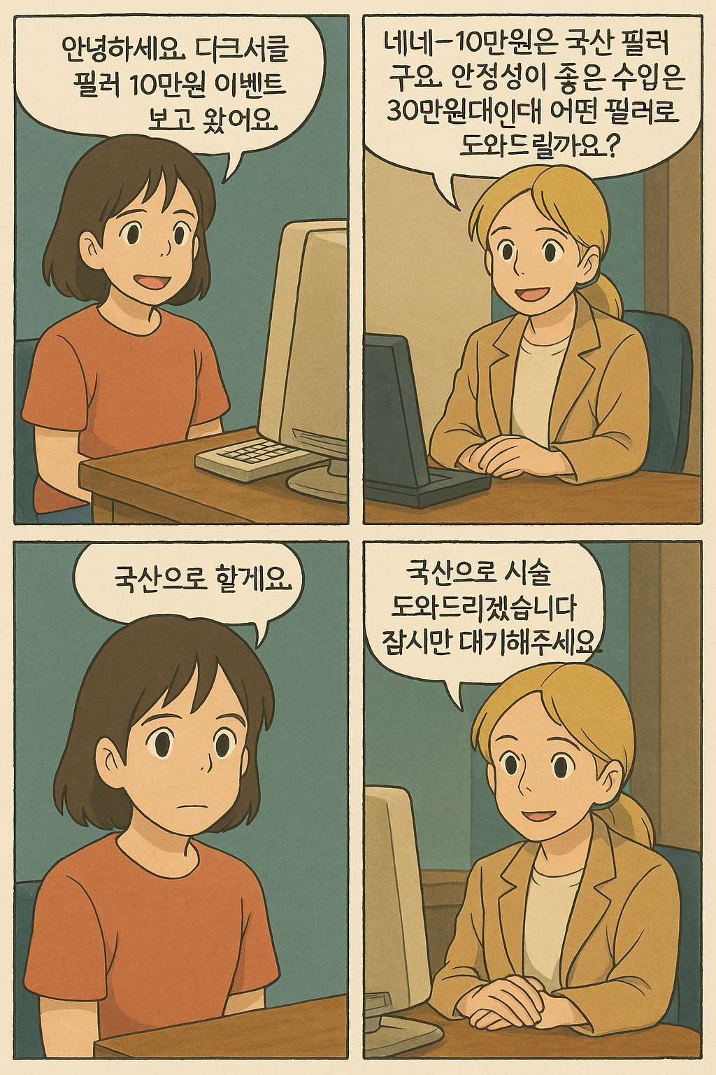 | 👩(환자분): 어플에서 다크서클필러 10만원 이벤트 보고 왔어요. 👱♀️(상담실장): 네 안녕하세요, 우선 보신 이벤트는 국산 필러로 진행되는 이벤트라서요. 조금 더 안정성이 좋은 수입은 30만원대인데 어떤 필러로 도와드릴까요? 👩(환자분): 국산으로 하고 싶어요. 👱♀️(상담실장): 네 그럼, 국산으로 시술 도와드릴게요. 잠시만 대기해주세요. (중략) |