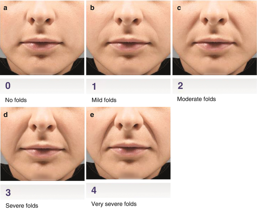 위와 같이 주름의 심한 정도를 0~4단계로 나누었을 때, 써마지 리프팅이 효과적인 분들은 2단계(Moderate folds)에 해당되는 분들이라고 생각하시면 좋습니다.