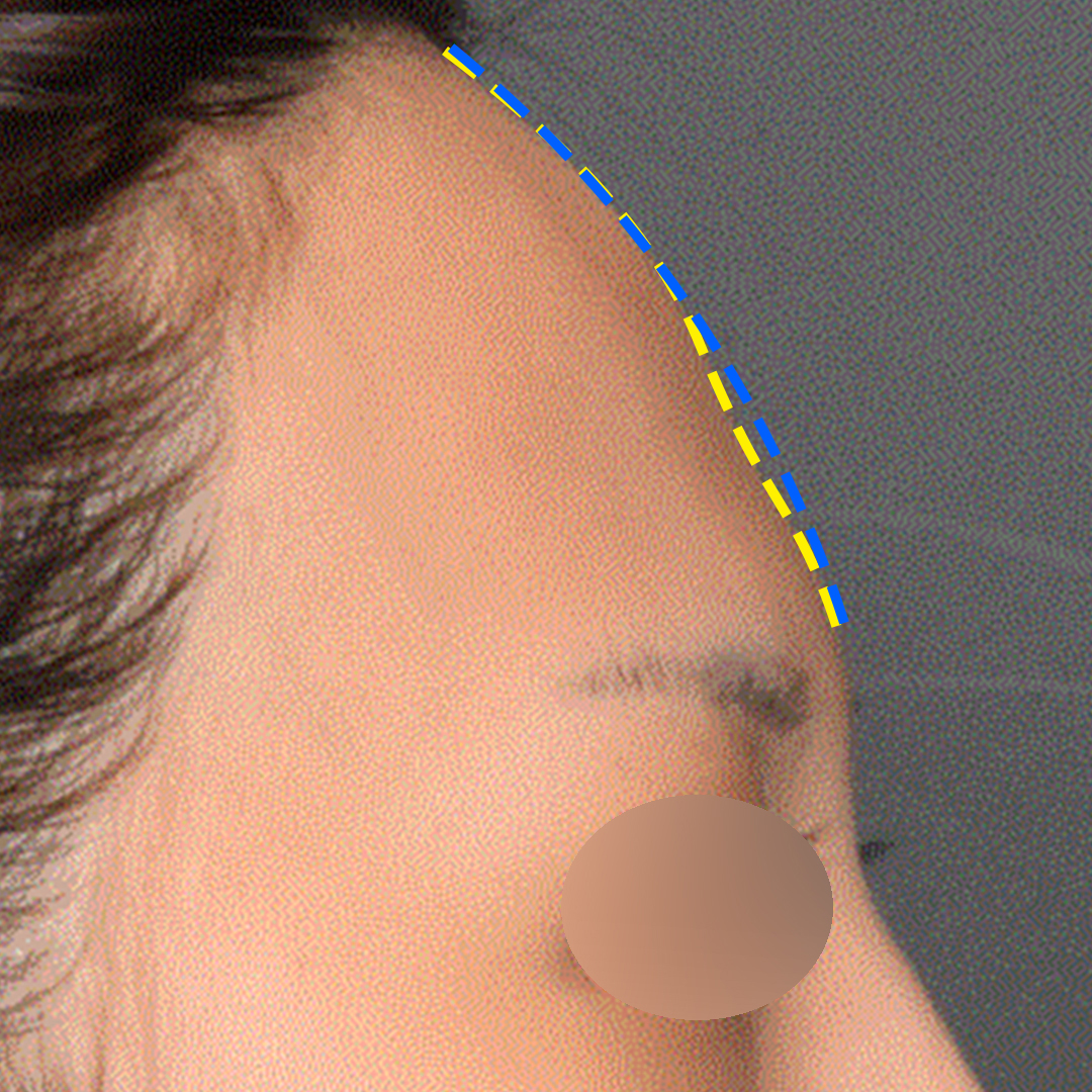 꺼진 부분을 수복하면서 전체적인 이마 볼륨감, 입체감을 더해준 라인을 볼 수 있죠.