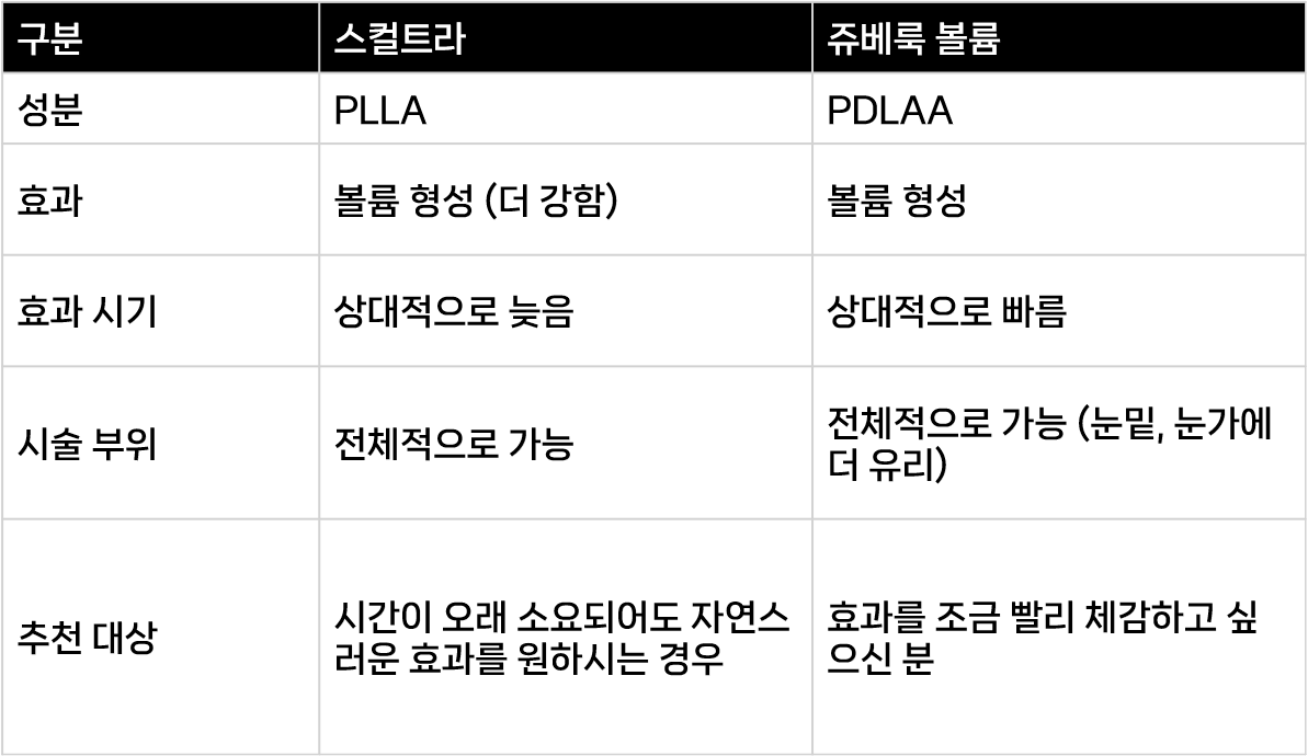 스컬트라와 쥬베룩 볼륨의 차이점을 간단한 표로 정리해봤는데요.