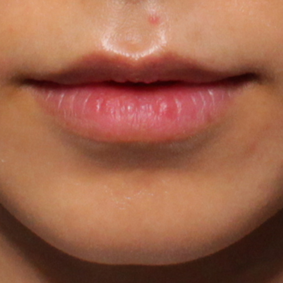 위 환자분의 경우 전체적인 입술모양, 라인에 대해서는 크게 문제가 없었지만 아랫입술이 윗입술에 비해 볼륨이 적은 상태라 위, 아래 입술 비율이 맞지 않은 상태였습니다. 좌, 우 비대칭도 있는 상태였고요.