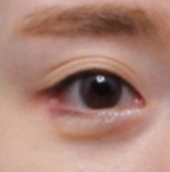쌍꺼풀 라인이 한 겹이 아닌, 두 겹으로 겹쳐있는 모습을 확인하실 수 있는데요. 눈두덩이 부위가 움푹 꺼지면서 피부층이 위로 말려 올라가 겹쌍꺼풀이 된 상태입니다.