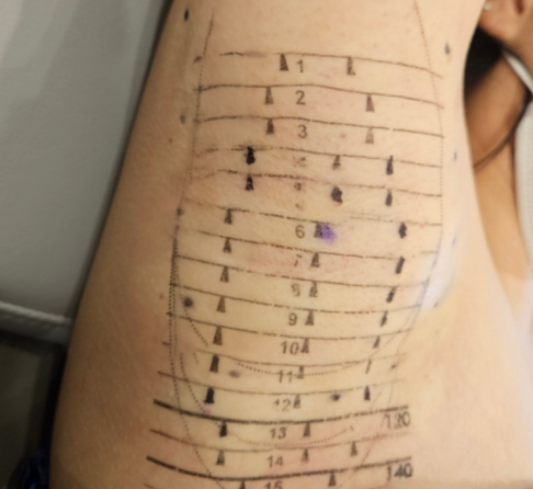 하지만 모든 환자에게 동일한 방식으로 적용하진 않고, 개개인의 땀샘 분포와 해부학적 특징에 맞춰 마킹 범위를 조정해 보다 정밀한 시술을 진행합니다.