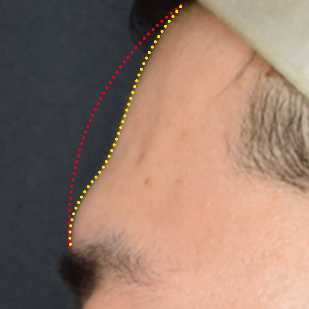 해부학적으로 남성은 여성보다 안와상융기(supraorbital ridge), 즉 흔히 ‘눈썹뼈’라 불리는 부위가 더 돌출되어 있는 경우가 많습니다. 이로 인해 이마 중앙 또는 상부의 볼륨이 부족할 경우, 눈썹뼈와의 구조적 비율이 어긋나면서 전체적인 얼굴 균형이 깨져 보일 수 있습니다.