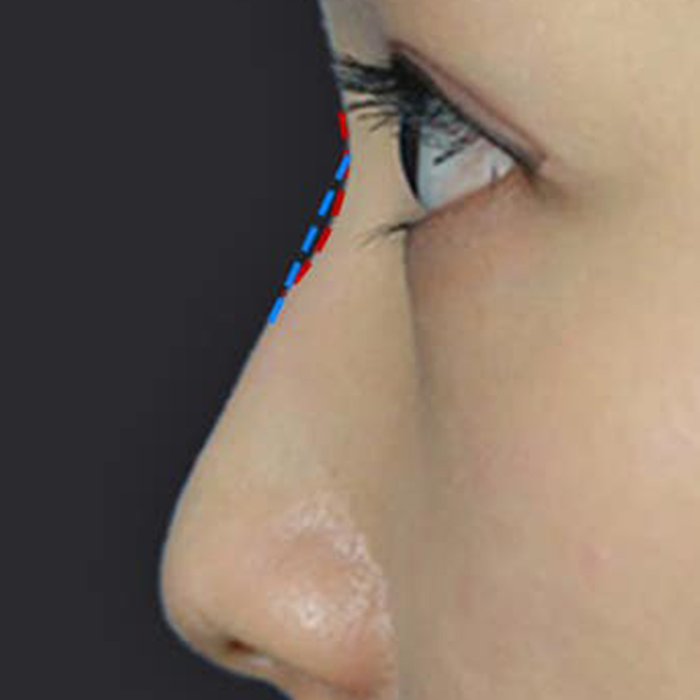 실제로 단순히 콧대 부분만 채운 사진을 연출해 보면, 개선된 듯 보이지만 어딘가 어색한 느낌을 받을 수 있습니다. 이런 경우 코끝까지 함께 디자인해야 훨씬 조화롭고 자연스러운 라인을 만들 수 있습니다.