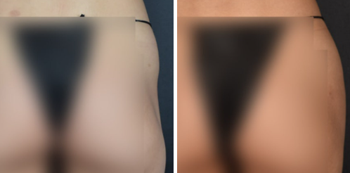 시술 전에는 골반 뼈 라인이 도드라지고 좌우 차이가 심했지만, 시술 후에는 꺼짐이 개선되면서 곡선이 자연스럽게 이어지고 좌우 균형도 맞아졌습니다.
