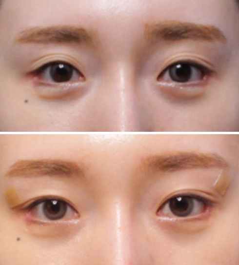 시술 전 사진을 보면, 눈꺼풀의 지방층이 줄어들며 쌍꺼풀이 두 겹으로 갈라져 있고, 피부가 꺼지면서 눈매가 피곤하고 나이 들어 보이는 인상이었습니다.