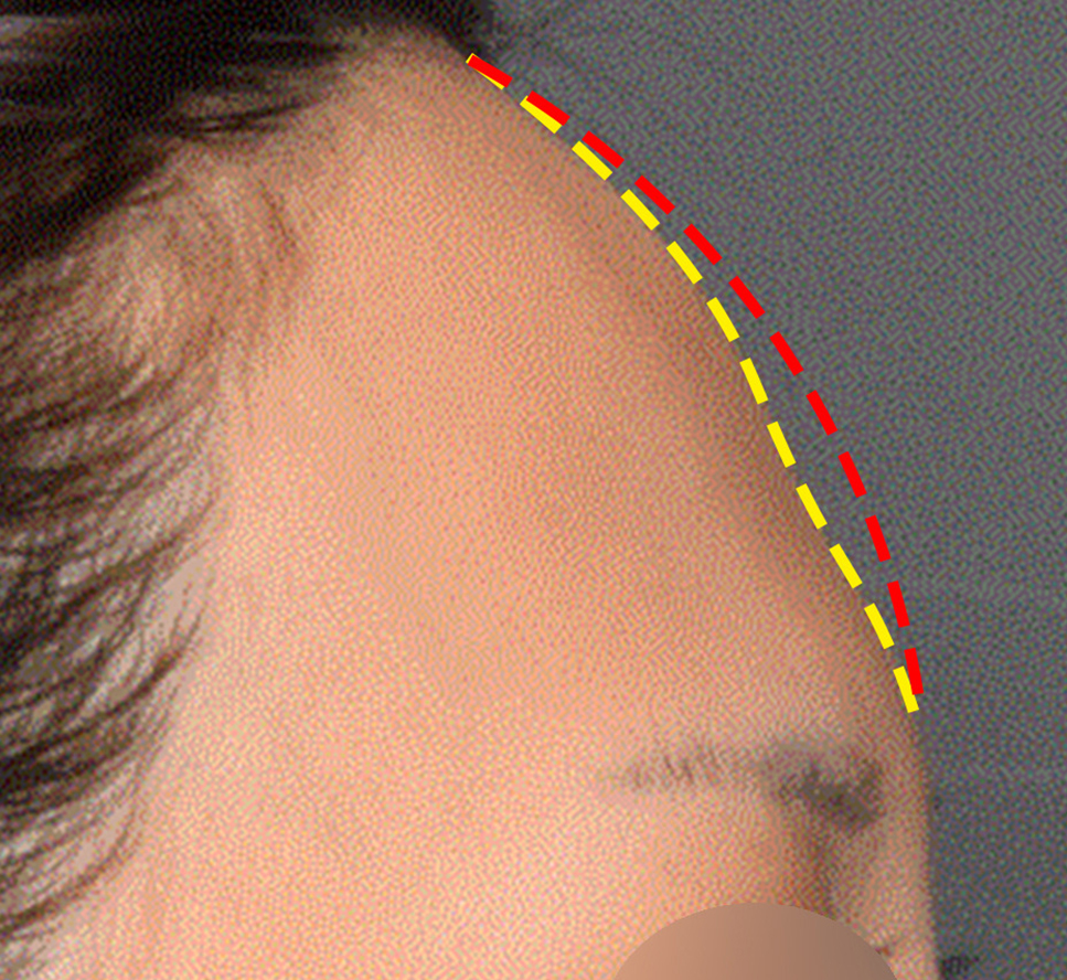 환자분의 사진을 보면, 이마 상부 전체가 강하게 함몰되어 있고 하부에도 약한 꺼짐이 겹쳐 전체적으로 아래 방향으로 경사진 형태였는데요.