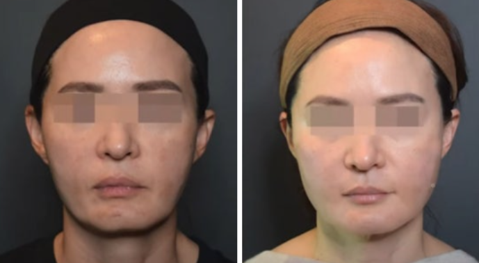 시술 전 볼륨 소실, 중안면 꺼짐, 턱 주변 윤곽의 흐려짐 등과 같은 문제들이 산재되어 있었는데, 2회차 진행 후 3개월 경과에서는 볼륨이 자연스럽게 살아나고, 광대 아래쪽의 꺼짐이 부드럽게 채워지며, 전체 윤곽선이 한층 부드러워진 모습으로 변화되었지요.