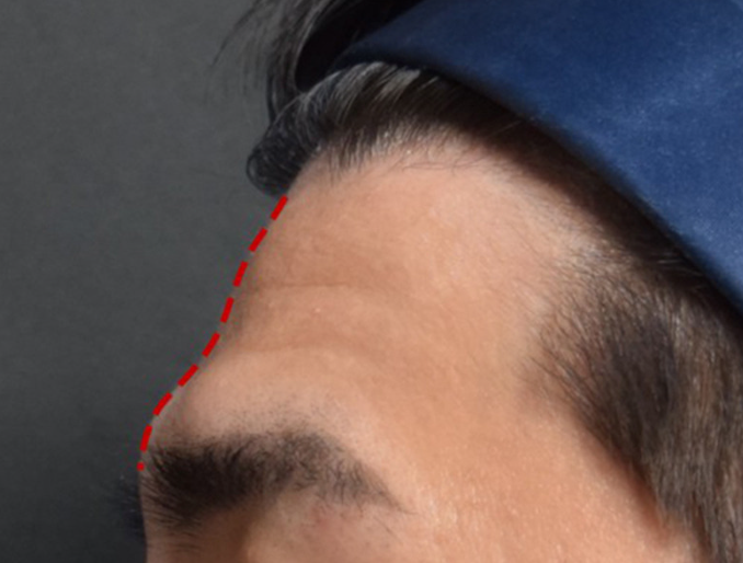 환자분의 이마 상태를 분석해보면 안와상융기 돌출, 이마 중심부의 뚜렷한 함몰, 탄력 저하 등의 문제가 복합된 전형적인 남성형 이마 구조였고요.