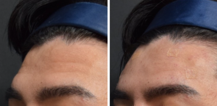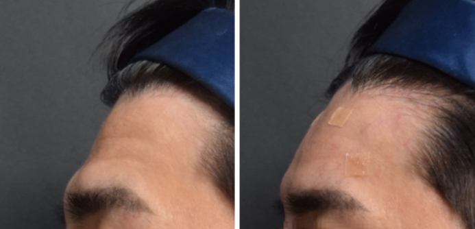 오늘 소개드릴 환자분은 30대 후반 남성으로, 이마의 깊은 가로주름과 중심부 꺼짐 때문에 내원하셨습니다.