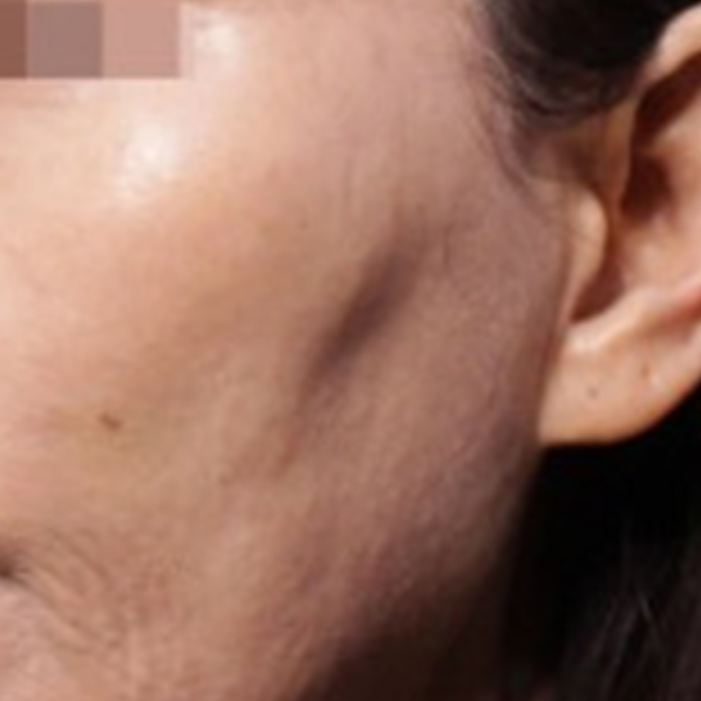 볼꺼짐이 특히 심했던 왼쪽 볼 부위를 확대해보면, 시술 전에는 윤곽이 울퉁불퉁하고 패임 부위에 어두운 음영이 강하게 보였습니다.