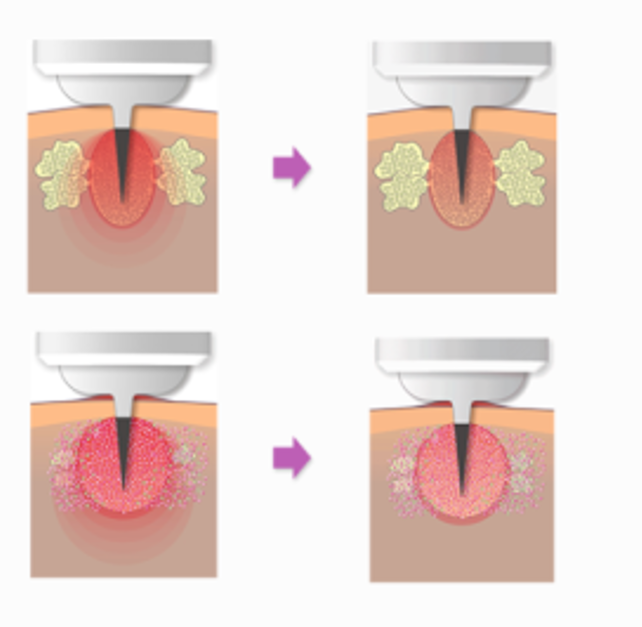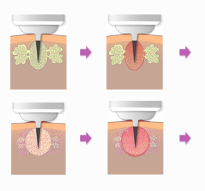 위 모식도처럼 고주파 에너지가 과증식한 조직에 직접 작용하여 제거를 돕고, 동시에 피부 재생 반응을 유도합니다.