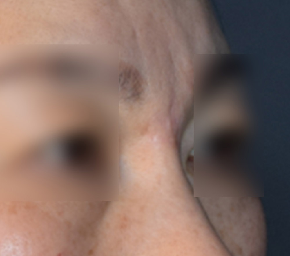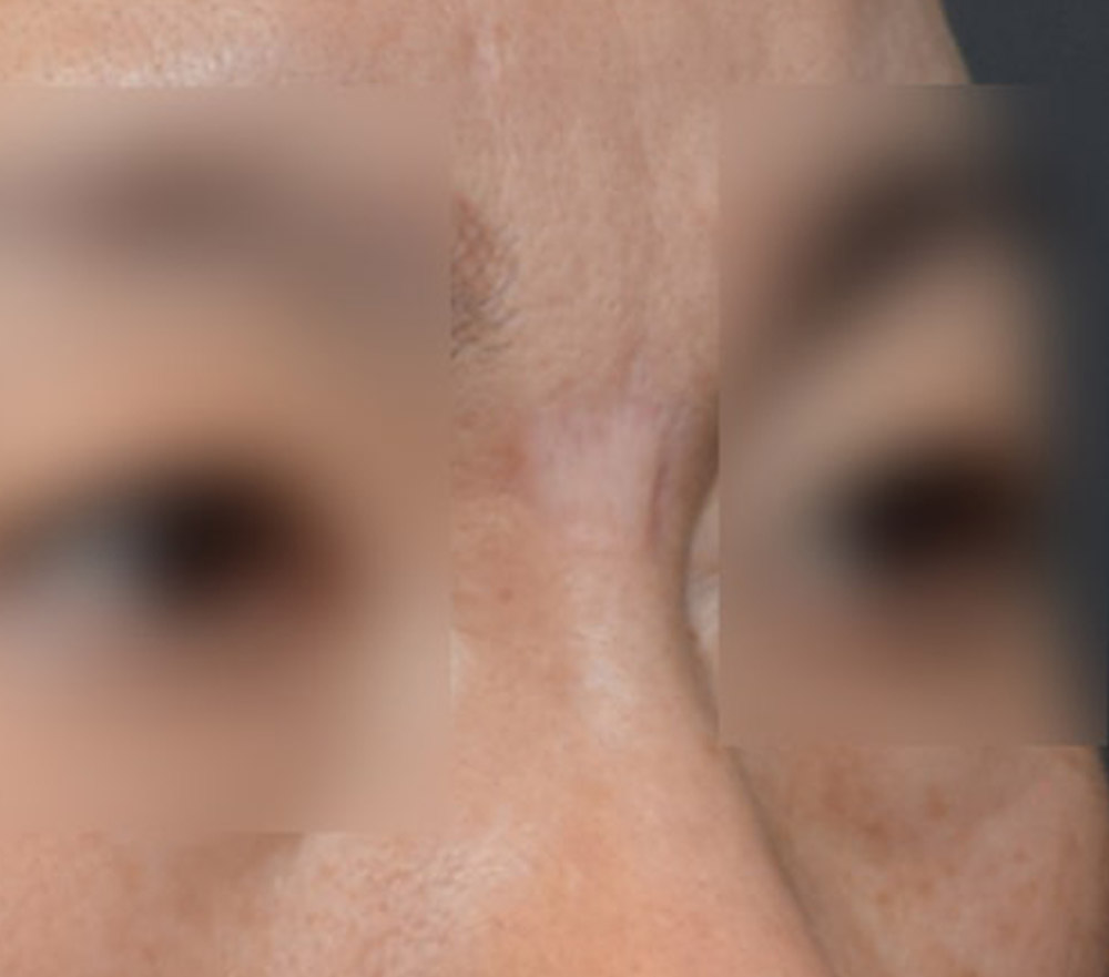 치료 전, 후 사진을 비교해 보면 그 차이가 더 명확하게 느껴집니다. 정면과 측면 어느 각도에서 보더라도 콧등의 흉터가 이전처럼 도드라져 보이지 않습니다.